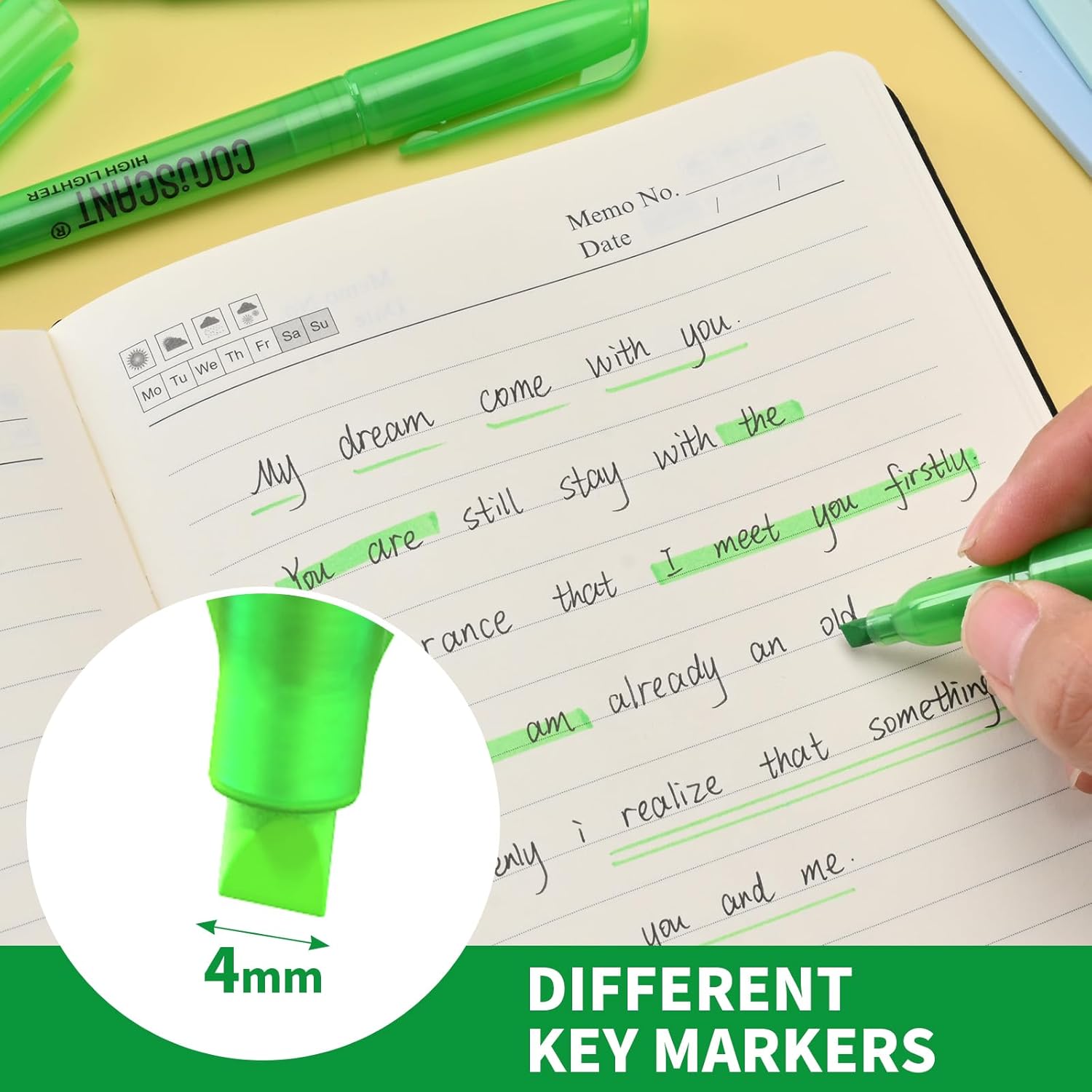 - VIBRANT GREEN:The vibrant green color it's more of a leprechaun green, ensures clear visibility on paper, perfect for highlighting important sections in bullet journals, books, work project, or other office and school supplies