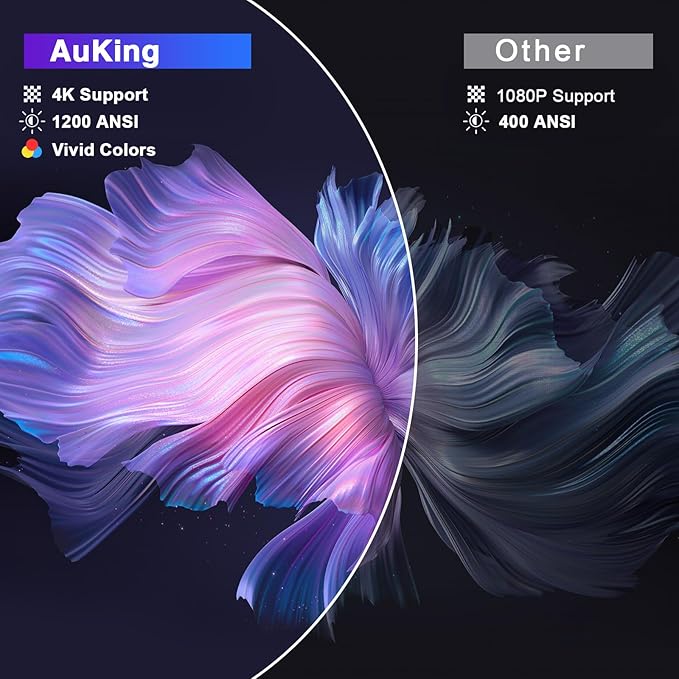 - [1200ANSI & 4K Support, Detail-first Visual Feast]This projector features 1200 ANSI lumens and supports input, ensuring crystal-clear images with stunning detail. With advanced LCD Pro and color reproduction technology, AuKing video projector is at least 98% brighter and clearer than other 1080P projectors, delivering natural light and dark filtering along with sharp contrast, enhancing realism and vividness in every scene.