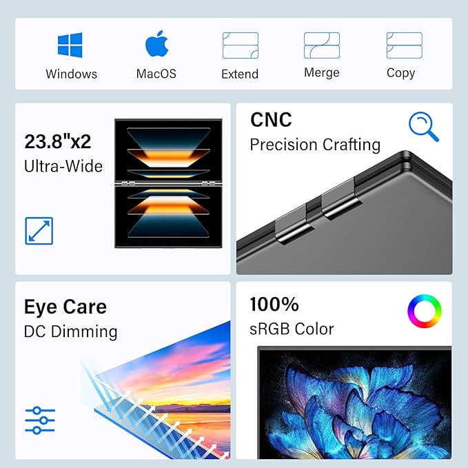 - 【Dual-Screen Flexibility vs. Traditional Large Monitors】 This 23.8-inch dual-screen monitor offers more screen real estate while saving desk space compared to traditional large single-screen monitors. Perfect for multitasking, work, study, and creative projects, you can view multiple apps and documents at once without cluttering your workspace.Note:Please make sure you’re powering the monitor by the original power adapter we provided in the package.