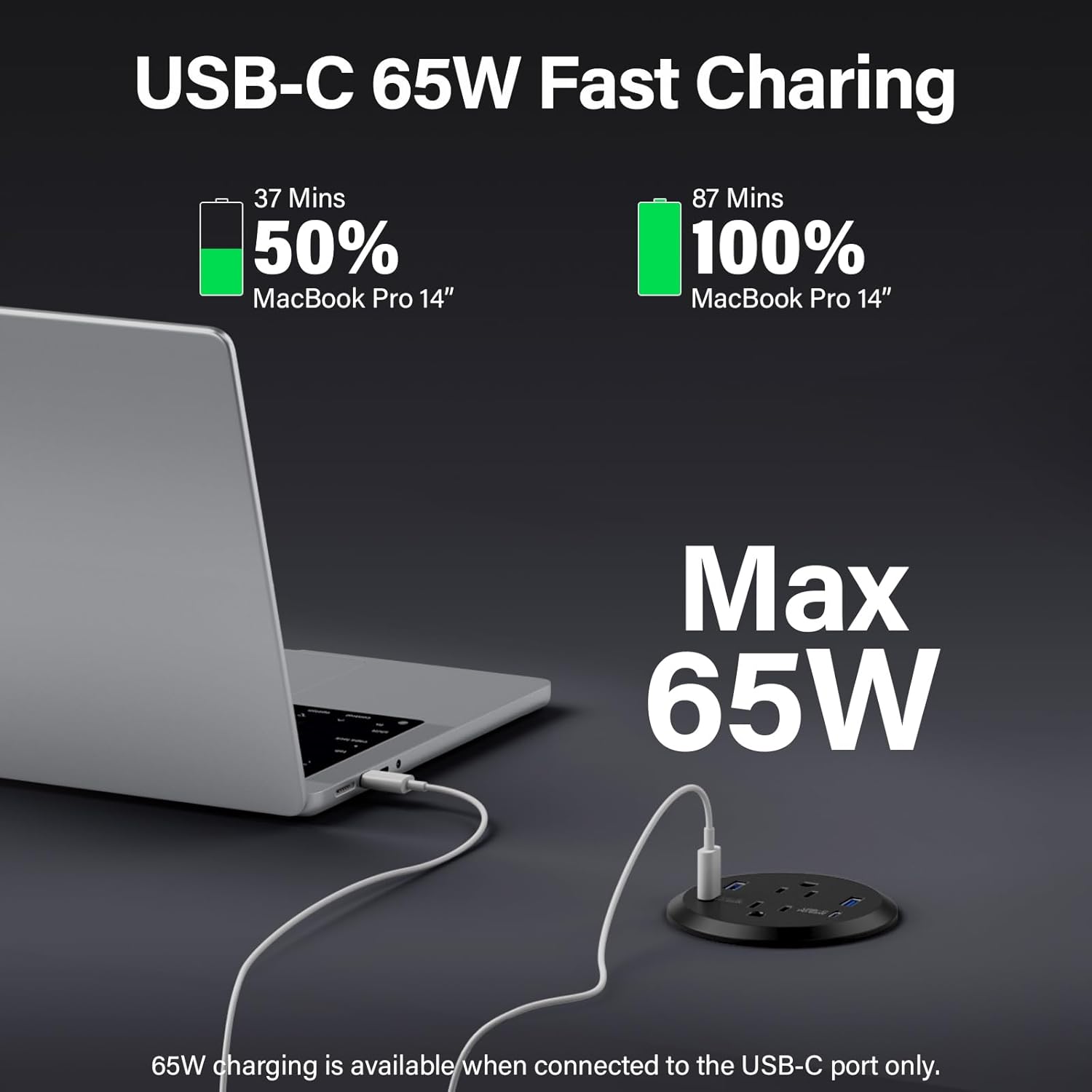 - Rapid Power Delivery: Our PD 65W USB C desk power grommet outlet is engineered for efficiency. It supports advanced USB PD 3.0, QC3.0, and PPS technologies to fast charge your devices. Utilize the mix of 2 USB-C and 2 USB-A ports to simultaneously power up your phone, laptop, smartwatch, and earbuds.