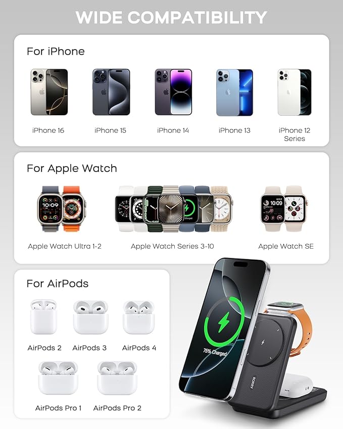 - 3-in-1 Charging Station for Apple Family: RORRY portable charger power bank combines a 10,000mAh power bank and a 3 in 1 charging station, which is compact and travel-friendly. The magnetic wireless portable charger is compatible with iPhone 16/15/14/13/12 Plus/Pro/Pro Max, for Apple Watch Ultra 2/Ultra/Series 10/9/8/7/6/5/4, for AirPods 4/3/2/Pro/Pro 2, and more.