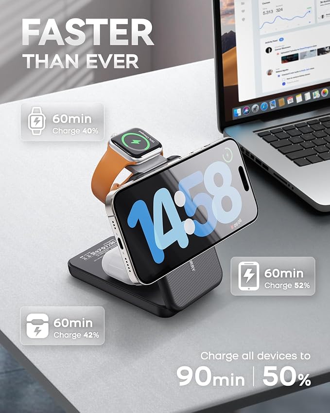 - Fast Charging Portable Charger: Takes just 30 minutes to charge for iPhone 16 Pro up to 56%, and 3.5 hours to fully recharge the power bank via the PD 20W USB-C port. Fully charge for iPhone, for Apple Watch, and for AirPods at the same time in just 2-3 hours. Wake up to fully powered devices, ready to go!