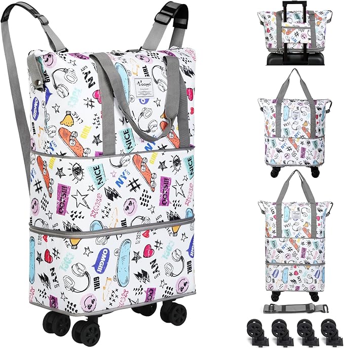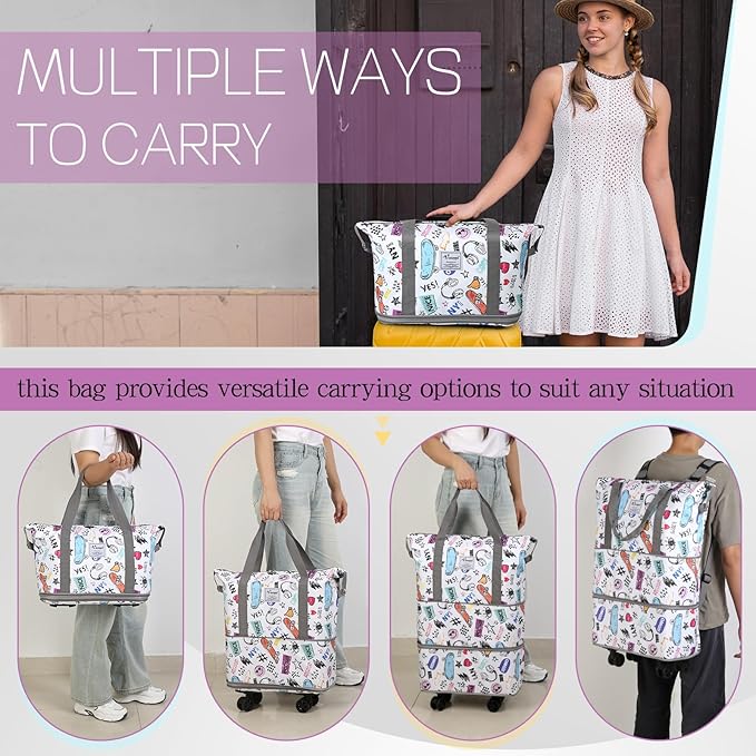 - 【Upgraded Duffel Bag with Wheels & Rolling Backpack】This foldable duffle bag for travel is crafted from thicker, scratch-resistant oxford cloth with stylish pattern, features 2 removable shoulder straps that can be adjusted between 26 to 44 inches in length, allowing seamlessly convert between carry on tote bag with luggage sleeve, rolling duffle bag with wheels, and large travel backpack. Its expandable capacity by 2 layers is with larger dimensions compared to standard market offerings