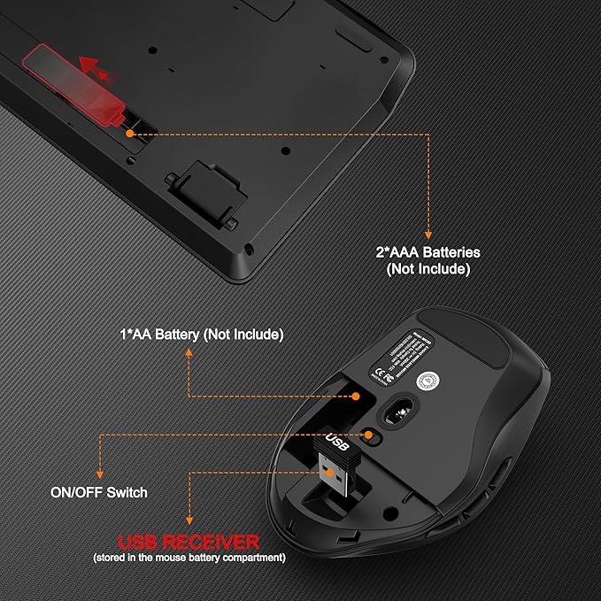 - ▶【Power Saving Function】Wireless keyboard and mouse combo features with auto power-saving function, when the keyboard is inactivity for 30 minutes and the mouse is inactivity for 10 minutes, they will both automatically enter sleep mode to save power. Press any button or key to wake up the mouse and keyboard. Note: The keyboard needs 2 x AAA batteries and the mouse needs 1 x AA battery. (Battery Not Included)