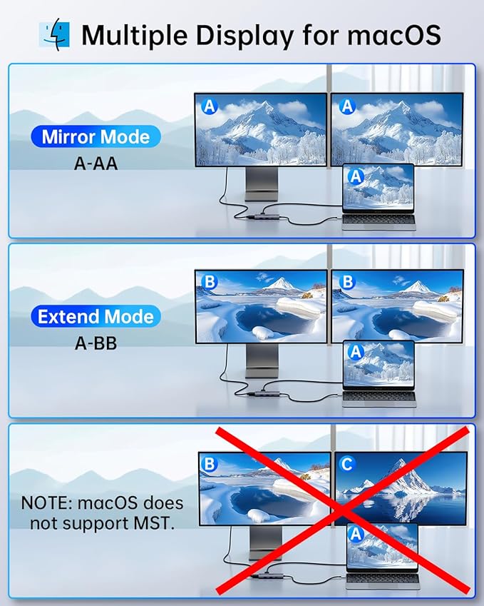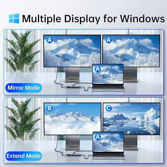 - 【Docking Station Dual Monitors】 This easy-to-use USB-C hub requires no driver installation. The monitor docking station features two 4K@60Hz HDMI ports, allowing for a dual-screen 4K@60Hz HD configuration with excellent temperature control and stability. Boost productivity with our docking station 3 monitors, which supports SST or MST mode under Windows for extending two monitors simultaneously.