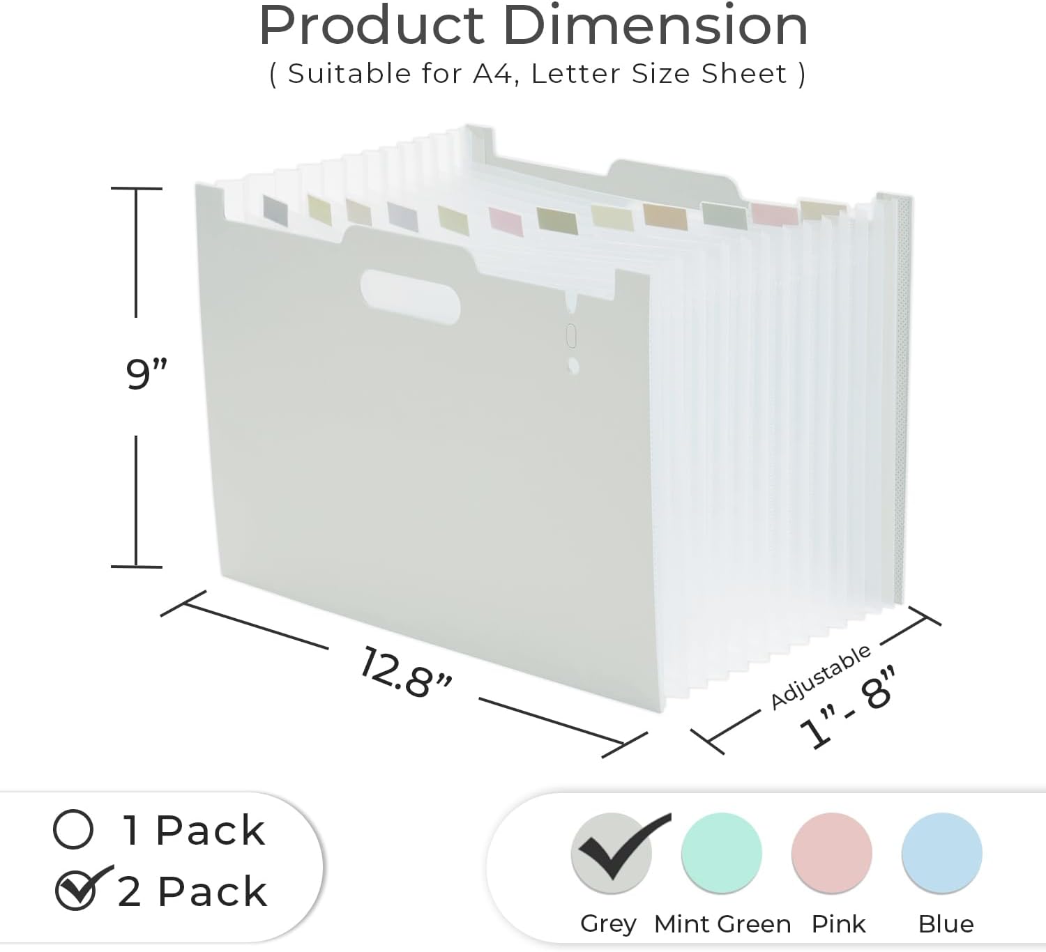 Y YOMA 2 Pack Accordion File Organizer with Handle 12 Pockets Expanding File Folder with Removable Tabs for A4 Letter Size Paper Portable Plastic Filing Organizer Document Bill Receipt Holder, Grey