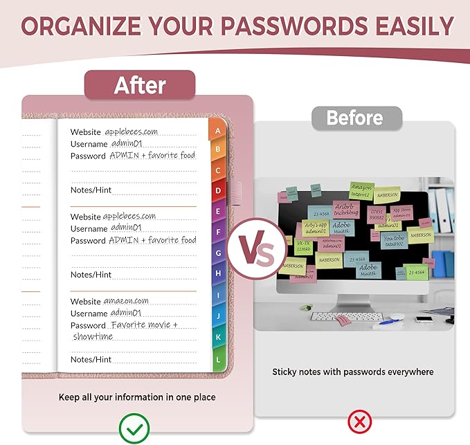- EASY TO USE: The password keeper book has colorful alphabetical print indexes. You can quickly locate the password you need and never worry about forgetting your password or losing time.