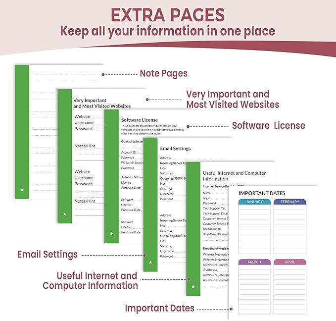 - AMPLE WRITING SPACE: This password log has 160 pages and can store up to 432 passwords. Each password entry has three lines and a colored divider for easy organization. In addition, you can record your important dates, Internet service provider, wireless router settings, Email settings, software licenses, most visited websites, and other notes.