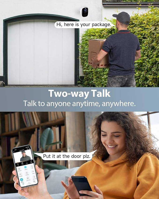 - 【2-way Talk & Device Sharing & Alexa】The camera also includes a high-quality two-way audio function that allows you to communicate with your family or guests from anywhere and at any time, or use Alexa to voice control the camera. Such as: communicating with the delivery man, warning burglars, or talking to your family and friends through the app. Share the device with up to 4 users simultaneously so that all the members can view the videos and protect them together.