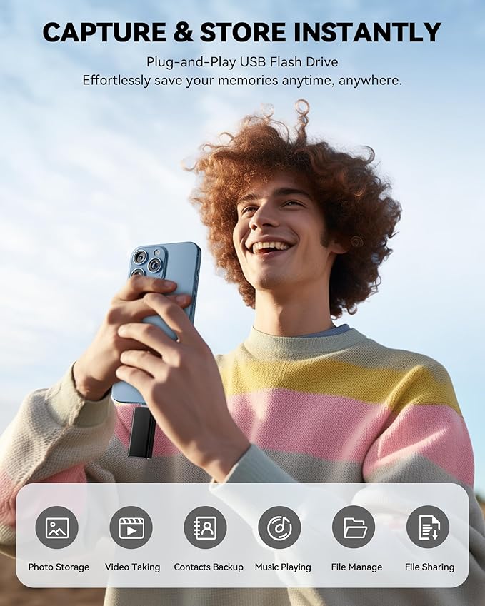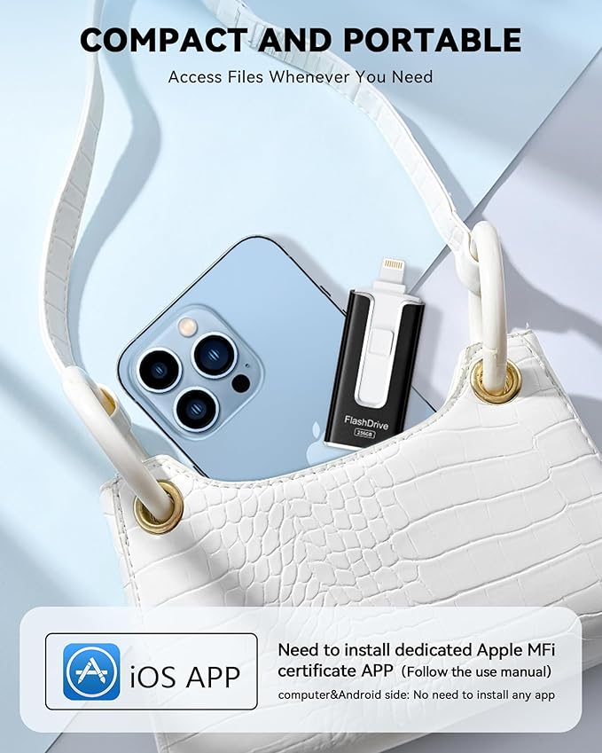 - 【Stylish, Portable, and Secure】With a compact and stylish design, this flash drive for iPhone is available in blue, pink, black and gold, making it easy to carry around. The built-in encryption option allows you to set a password via the APP to secure your personal files, photos and videos, ensuring you have peace of mind when storing and accessing your precious memories while traveling or for daily use.