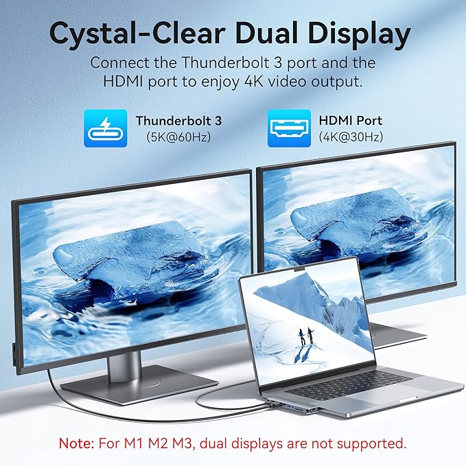 - Enhanced Connectivity with 4K HDMI and 5K Thunderbolt 3 MacBook Hub: Elevate your MacBook experience with our versatile USB C Hub. Enjoy stunning 4K resolution at 30Hz through the HDMI port and immersive 5K visuals at 60Hz via the Thunderbolt 3 port. Achieve Dual Monitor Display effortlessly—mirror or extend your laptop screen to TVs, monitors, or projectors. Note: MacBook models with M1, M2, or M3 chips do not support dual external monitors simultaneously