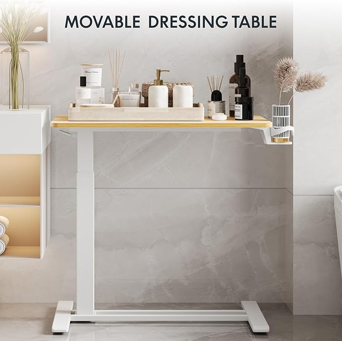 FLEXISPOT H7 Adjustable Overbed Bedside Table with Wheels Pneumatic Mobile Standing Desk Laptop Desk Rolling Computer Cart Movable Table Hospital Home Use(31.5" W x 17.7" D, Maple Large)