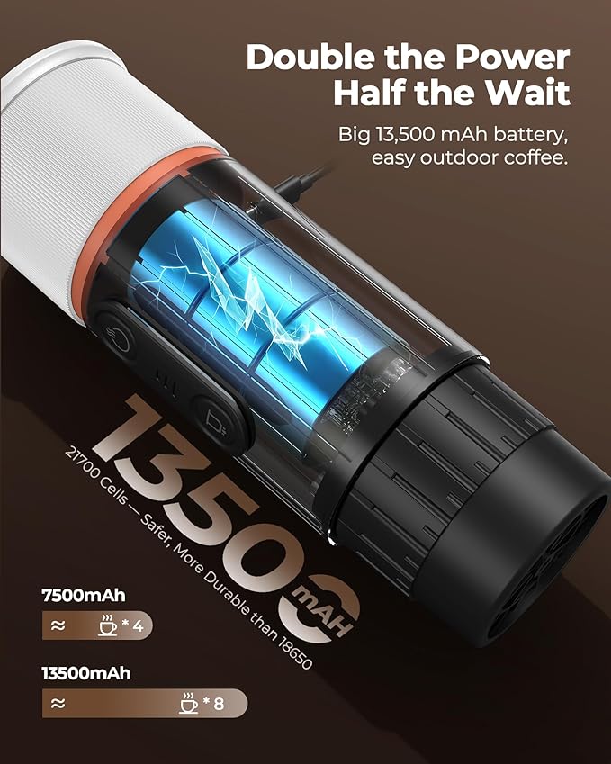 - 13500mAh XL BATTERY & BIG SAVINGS: Twice the power of 7000mAh rivals, it brews 8‑10×40mL shots or keeps lattes and iced coffee hot all afternoon, cutting a $5‑a‑day coffee habit to pennies—paying for itself in 3 weeks on road trips, hikes and tailgate parties.