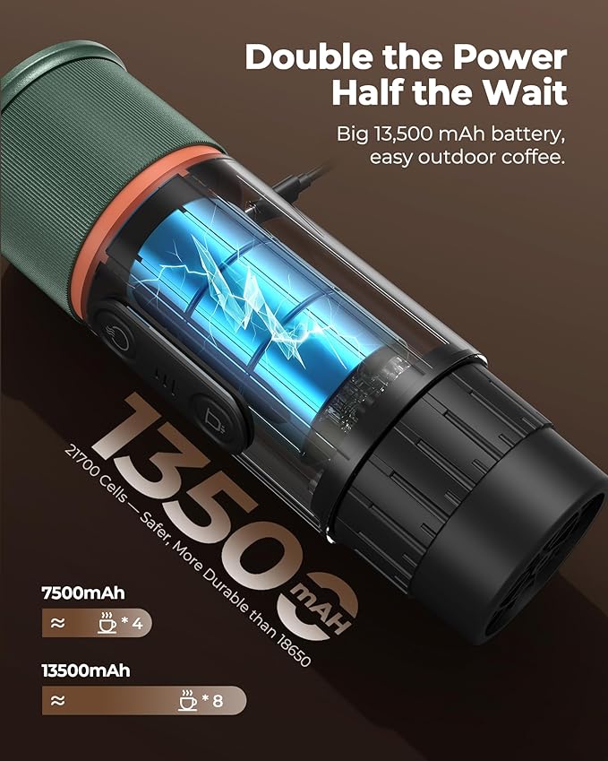 - 13500mAh XL BATTERY & BIG SAVINGS: Twice the power of 7000mAh rivals, it brews 8‑10×40mL shots or keeps lattes and iced coffee hot all afternoon, cutting a $5‑a‑day coffee habit to pennies—paying for itself in 3 weeks on road trips, hikes and tailgate parties.