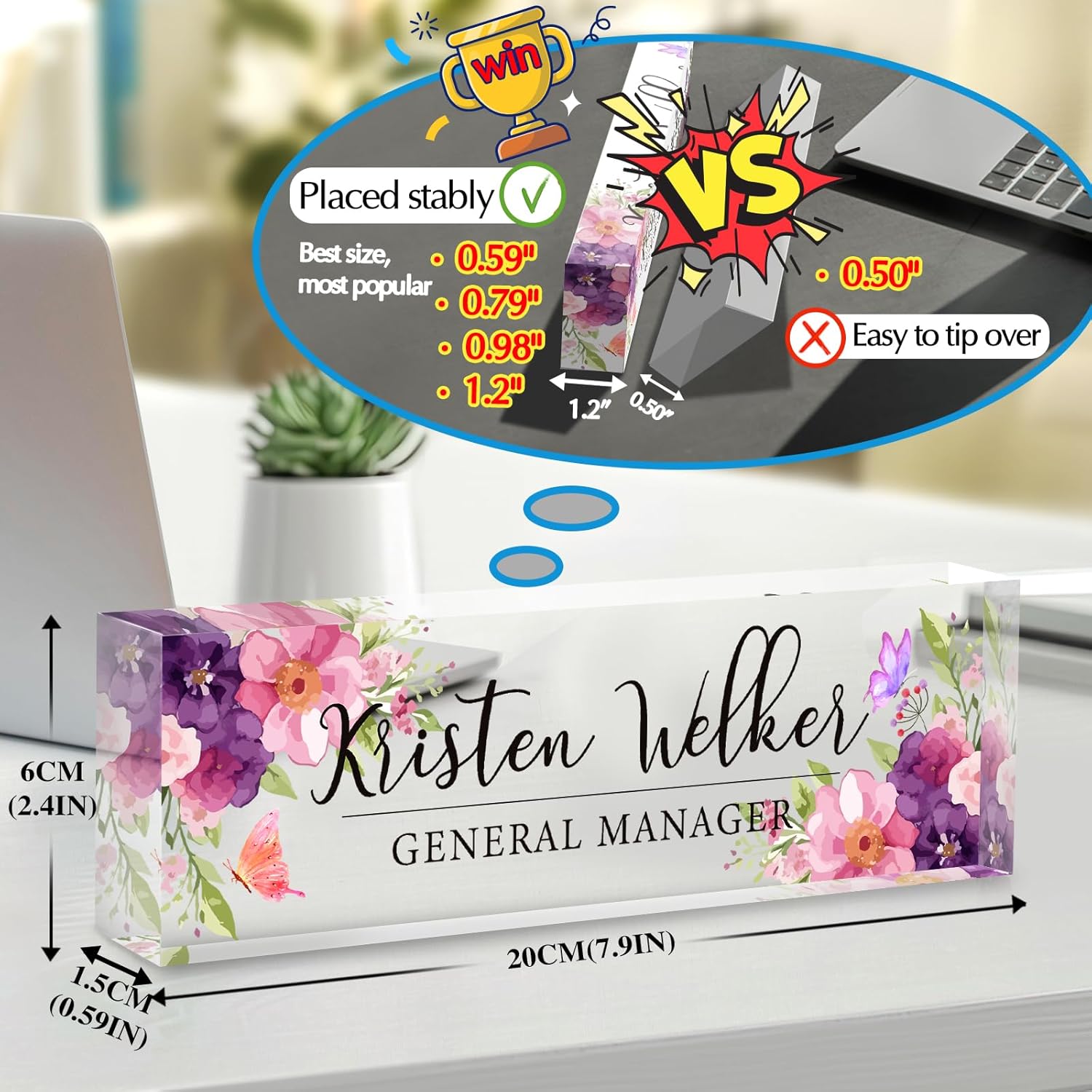 - 【Thickness upgraded to 0.79-1.18 inches】 According to market research, most people who received 0.59-inch thick acrylic nameplates would have problems with instability and easy to tip over, which would bring a terrible shopping experience. From the customer's perspective, we pause Selling a 0.59-inch nameplate, we provide 0.79-inch/0.98-inch/1.18-inch thick acrylic for selection. The 1.18-inch size is the most popular gift size, More fashionable and atmospheric, We aim to bring your vision to life!