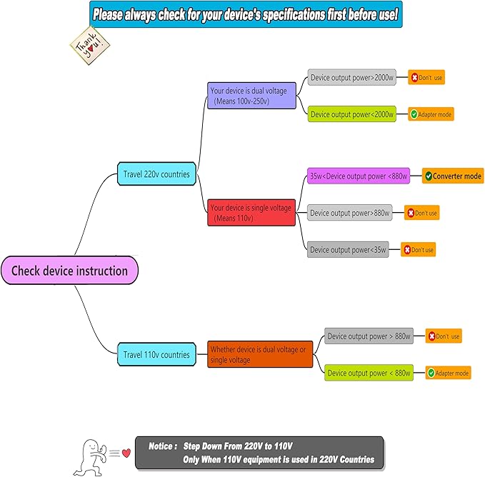 - ✈【220v to 110v Voltage Converter】- When traveling from the US to Europe with electronics like hair dryers, you may have issues with incompatible voltages. Because some devices may need 110V, while European countries operate at 220V. This voltage converter steps down the voltage to 110V, ensuring safe and efficient operation of your devices. NOTE THAT THE CONVERTER MODE SUPPORTS WATTAGE RANGES OF 35W TO 880W.