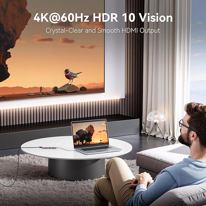 - 4K@60Hz HDMI to USB C hub: This usbc hub allows you to achieve up to 4K@60Hz (3840 x 2160) cystal-clear image,down compatible with 2K@120Hz, 1080P.This macbook air accessories adapter allows to mirror or extend your laptop screens or monitors by connecting monitors tvs projectors with hdmi ports.Please note that your usb c deviceβs usb c port must supportsvideo output (display port alt mode or thunderbolt),otherwise it will wonβt output images on monitors or screens