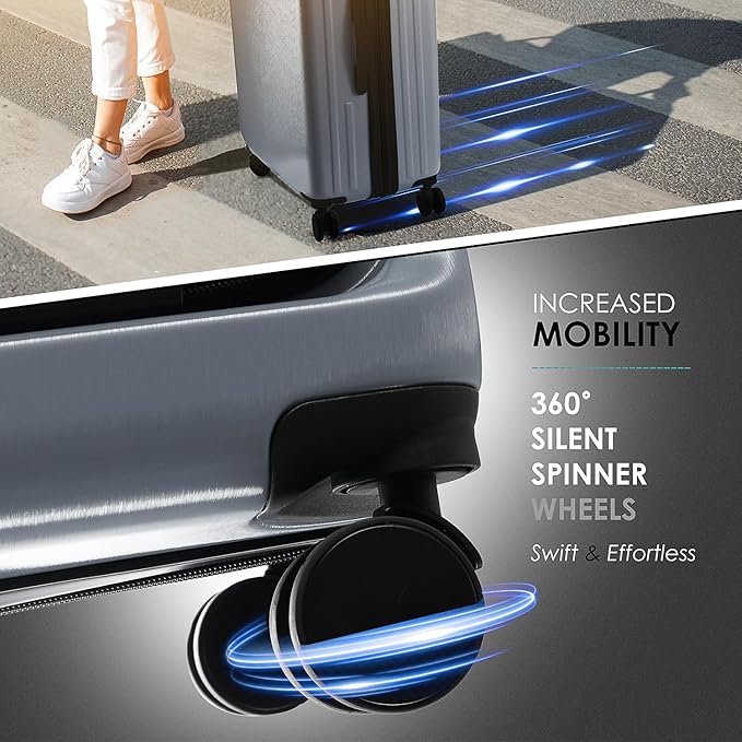 - Luggage Sets with Spinner Wheels: Our large suitcases with wheels provide smooth 360° movement. This rolling suitcase, hardside luggage set includes telescoping handles, stainless steel name tags, and TSA locks.