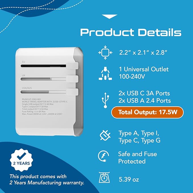 - [WORLD TRAVEL ADAPTER WITH USB PORTS] Perfect for modern travelers, this world travel adapter includes 2 USB-A and 2 USB-C ports 17.5 W Max power allowing you to charge up to 5 devices simultaneously. Itβs the ideal international adapter for smartphones, tablets, laptops, and more for 110v-240v devices