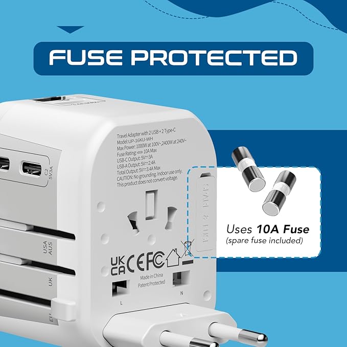 - [2-YEARS MANUFACTURING SUPPORT] - Ceptics international adapter for travel comes with 2-years manufacturing support, providing peace of mind. Our travel plug adapter worldwide is CE, RoHS certified, Fuse protected and comes with a spare 10A fuse for easy replacement. This universal charger adapter is not a voltage converter It will not convert voltage make sure your item supports worldwide 100-240V.