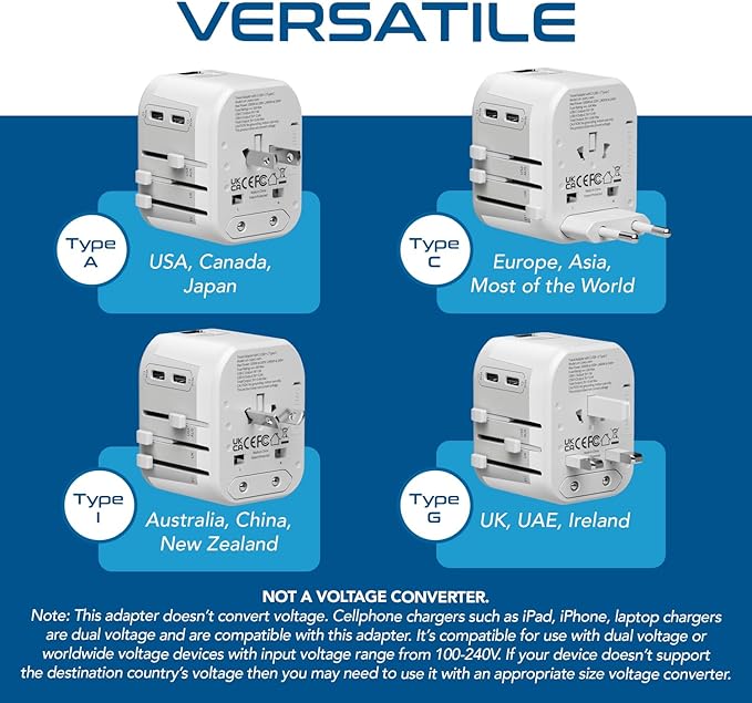 - [GLOBAL COMPATIBILITY] Travel adapter worldwide covers 150 countries: Type C - France, Germany, Italy, Spain, Iceland, Greece, Israel; Type G - UK, Ireland, London, England, Scotland, Dubai; Type I - China, Australia, New Zealand; Type A - USA, Japan, Canada and more, suitable for your worldwide travelling
