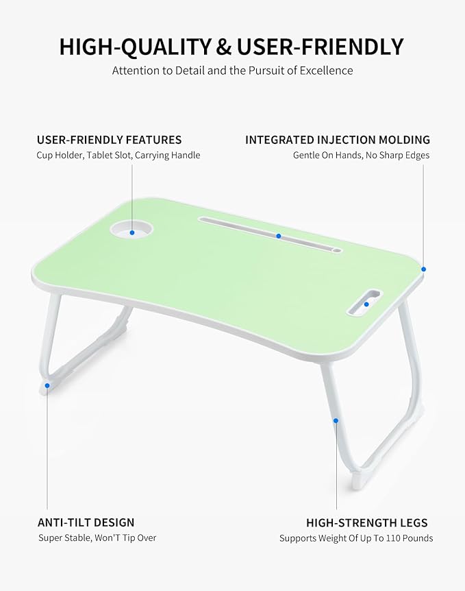 Laptop Bed Desk, Foldable Lap Table, Portable Study Table, Laptop Stand with Cup Holder & Tablet Slot & Lifting Handle for Working Writing Drawing & Eating - Green