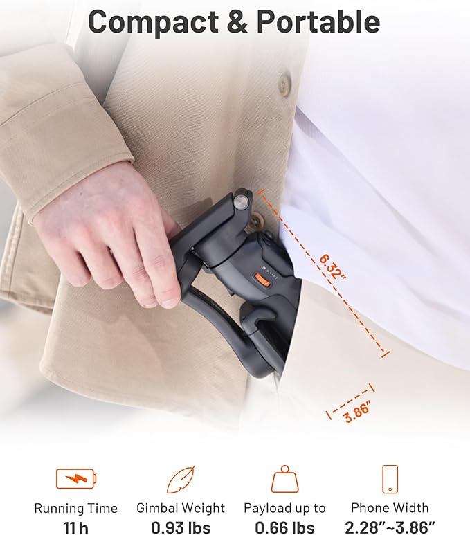 - 【Gimbal On-the-Go】Payload: 300 g; Foldable and compact, the pocket-sized design makes it easy to carry the iSteady X3 phone stabilizer around and be ready to shoot at any time; A built-in extension rod and tripod expand the field of view, allowing you to unlock high and low-angle shots easily; Fully charged in 2 h, hassle-less shooting all day long