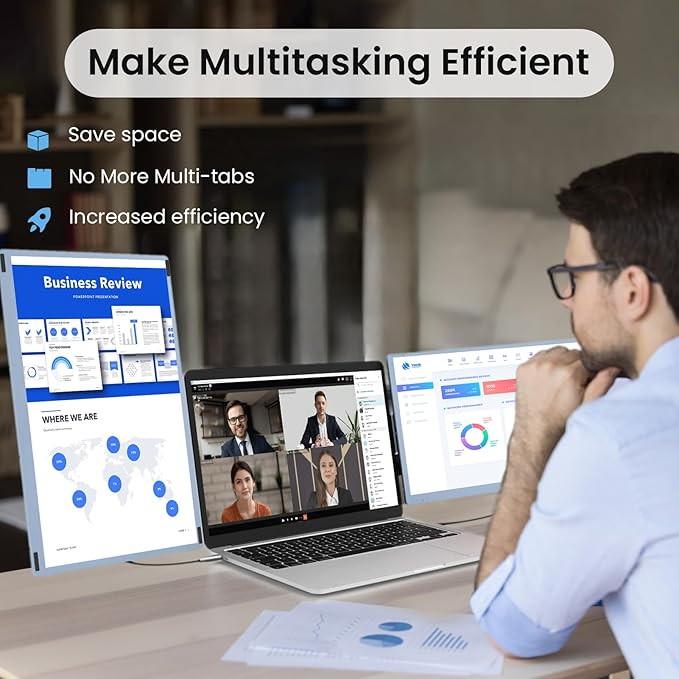 - 【Plug and Play, No Driver Required】This is a triple laptop screen extender for 13"-17.3" laptops, whether you choose a USB-C, USB-A or HDMI connection, simply plug in the laptop screen extender and start your daily use without drivers. (Please note: When using the HDMI cable, connect an additional USB-A to USB-C cable on the same screen extender for power supply)