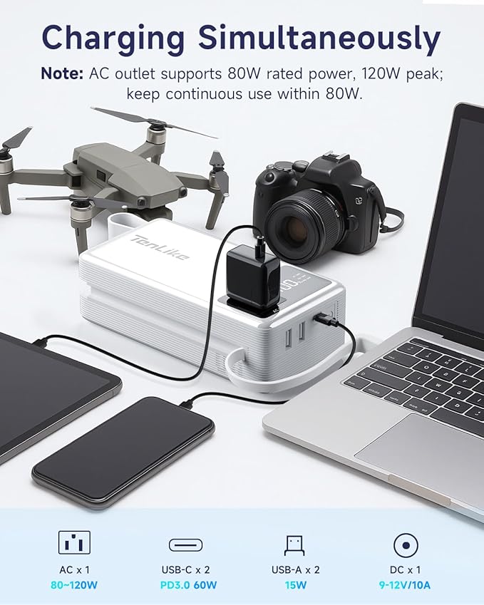 - 【Type-C 60W & 2/3-Prong AC Ports 120V 80W Rated 120W Peak 】Type-C supports 60W PD fast charging, with an AC rated power of 80W and a maximum output of 120W. It can not only charge digital devices like phones, tablets, Switch, and drones, but also power small appliances with 2/3-prong plugs, such as laptops, fans, mini fridges, speakers, and photography lights