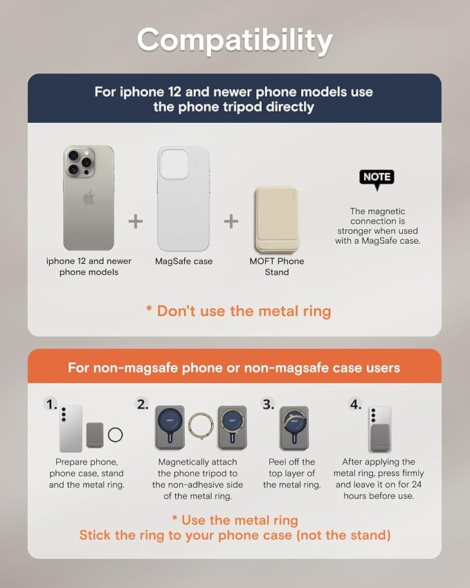- Universal Compatibility: MOFT Phone Wallet is compatible with iPhone 17/16/15/14/13/12 series and MagSafe cases. For other devices (such as Samsung) and non-magnetic cases, the phone stand can be attached using the included metal ring. Please check the product dimensions (3.8in X 2.5in X 0.35in) to ensure it fits the back of your phone without obstructing the camera. The slim design ensures your phone’s lenses stay unobstructed—perfect for Instagram-worthy shots at cafes or business events.