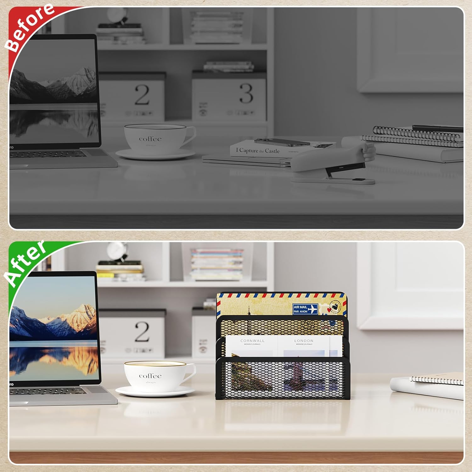- 【Mesh Metal Materials】Crafted from durable metal mesh, our three-section mail organizer countertop is built to last. It's crafted to resist damage and deformation, making it a sturdier, more durable option compared to typical plastic file holders on the market