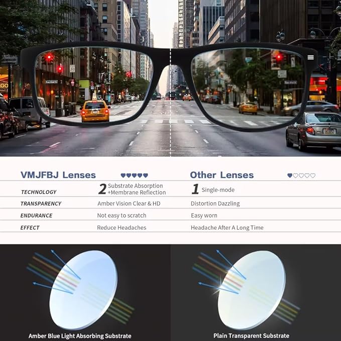 - BLUE LIGHT GLASSES AMBER LENS UPGRADE: VMJFBJ blue light glasses amber base lens upgrade technology, more eye protection!Substrate absorption+Membrane reflection dual protection blocks 99% harmful blue light from 385-445nm and receives beneficial blue light from 445-505nm, giving your eyes the highest level of protection! Say goodbye to blurred vision, eye strain, headache and migraines caused by long hours in front of computer, mobile phone, TV and other electronic screens.