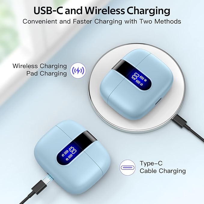 - Wireless Charging and IPX5 Waterproof: The charging case of these bluetooth earbuds support wireless charging and USB C cable charging. These wireless headphones are rating at IPX5 waterproof, the nano-coating on earbuds surface can prevent water and sweat from penetrating, which can use as sport wireless headsets. You can listen to the music while running, working, reading, sleeping, meeting, etc
