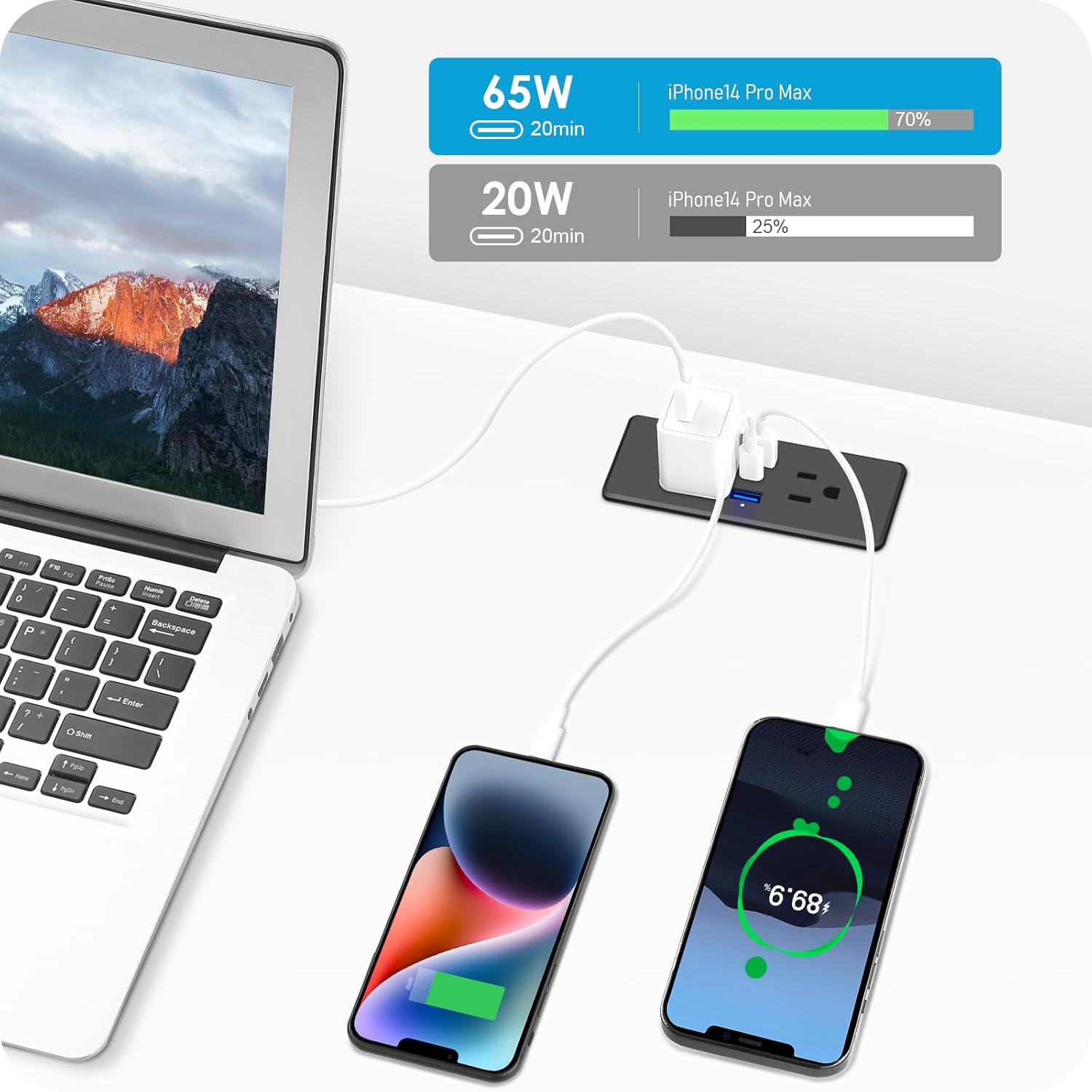 - 65W Fast Charging Power Strip: 2 Outlets Output rating 10 Amp / 125 Volt / 1250W. Come with fast charging QC 3.0 36W Max USB-A port and PD 3.0 65W Max USB-C port. Different phones, iPads, laptops, and many many other things and this has every single plug in one strip, USB, usb c, and standard plug. They charged fairly quickly too.