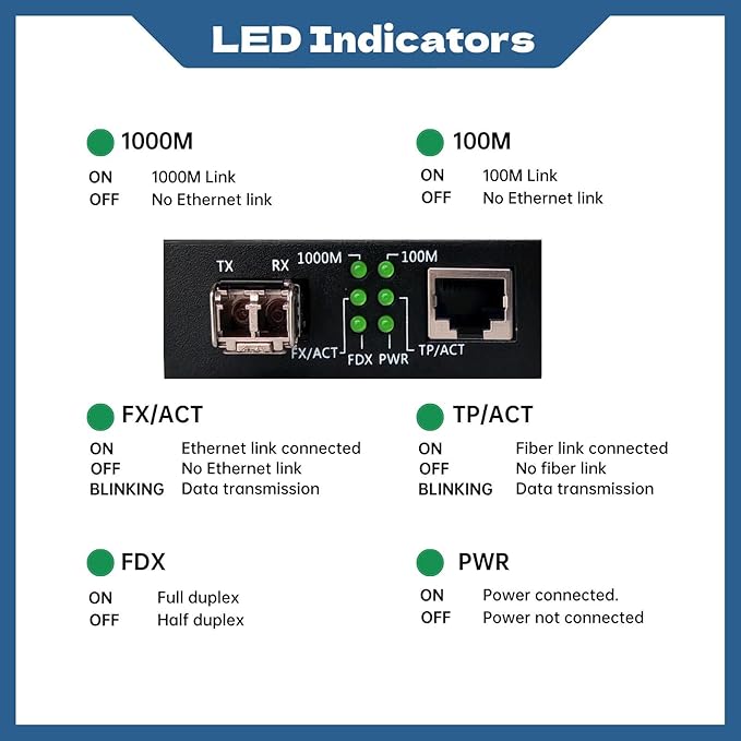 - 【Plug & Play】Simple installation with no configuration needed, just connect your fiber and copper cables to start transmitting data,6 LEDs Expose Real-Time Speed & Link Status.
