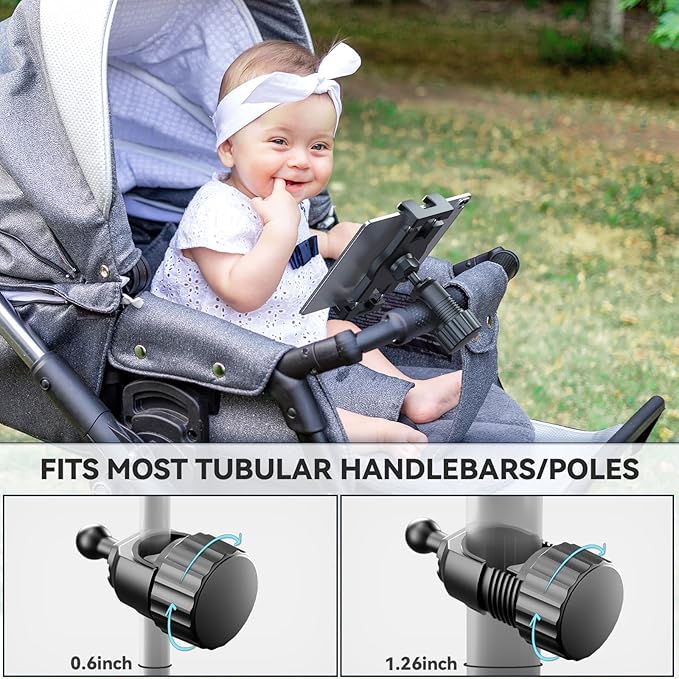- ADJUSTABLE TABLET CLAMP - bike cell phone holder fits handlebars with a diameter of 0.6 to 1.26 inches. Can be used for electric scooters, strollers, mountain/road/electric bikes, dirt bikes, ATVs, Wheelchair or tripods, microphone stands, etc.