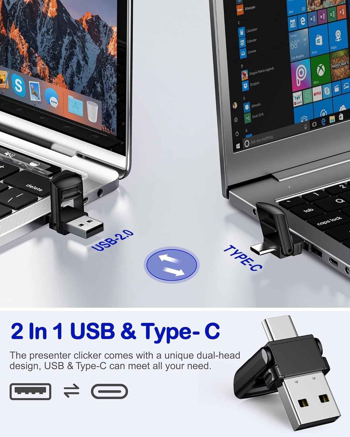 - 2-IN-1 USB Type C Wireless Presentation Clicker : The presenter clicker comes with a unique dual-head design, USB & TYPE-C can meet all your need. You can smoothly switch between different port devices such as Mac, laoptop and pc, one for multiple computers. At the bottom of the slide clicker there is a magnet which can hold your USB dongle securely. (Powered by 2pcs AAA Battery are not included)