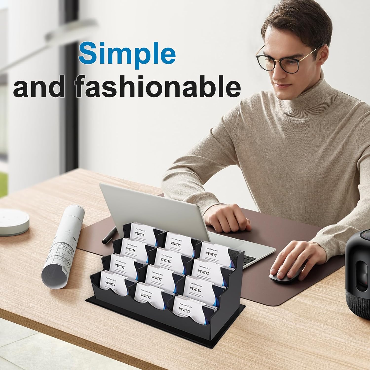 Business Card Holder, Acrylic Business Card Display, Clear Desktop Business Card Stand for Exhibition, Home & Office Black 4 Tiers 12 Slots