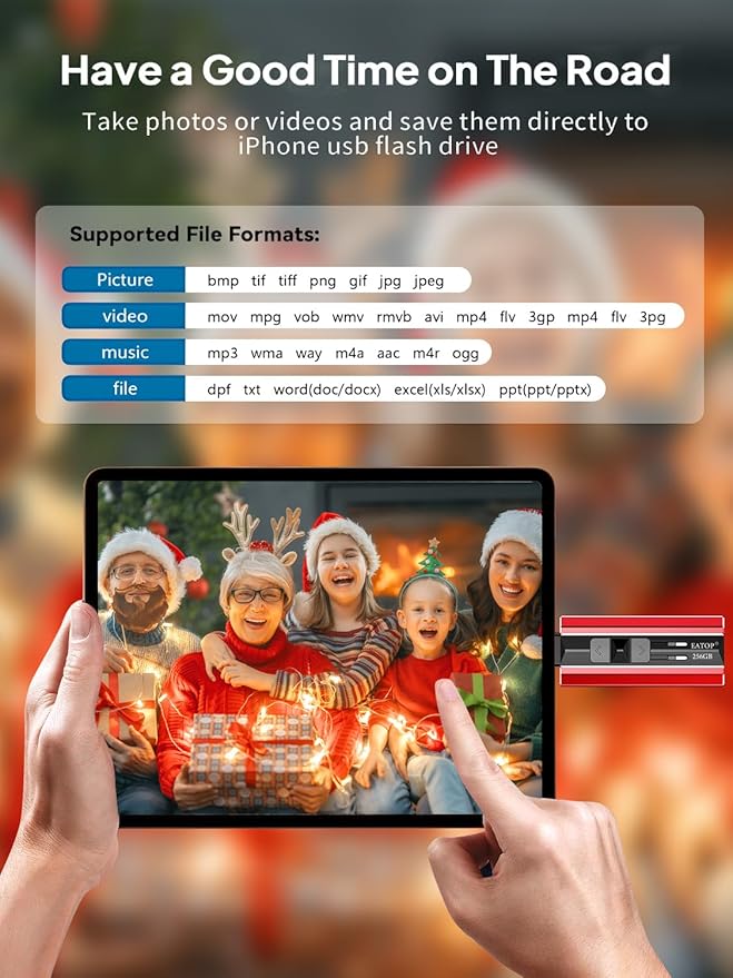 - 【Watch Movies, Photos and Play Music Directly From Phone Flash Drive】Store your favorite videos, audios and music on your Phone's Photo Stick, then seamlessly plug and play on your Phone or Tablet anytime, anywhere. No more need for Internet or WiFi.This Phone storage device plays videos in many different formats.Pictures stored on the Phone storage device also support different formats. Great way to store all your pictures and videos on an phone external storage device.