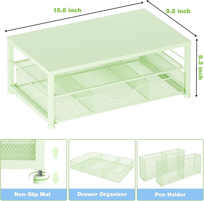 Desk Organizers and Accessories, 2-Tier Computer Monitor Stand Riser with Drawer and 2 Pen Holders, Laptop Stand, Office Desk Accessories for Office Supplies, Green
