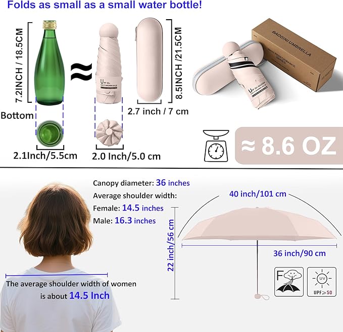 - Pocket umbrella: With a 40-inch arc and a 35.4-inch diameter, this mini travel umbrella is perfect for concealing in your purse or bag when youβre on the go! Folds to an ultra-compact 6.9 inches, makes the umbrella great for travel, as this super lightweight umbrella collapses about the size of your palm