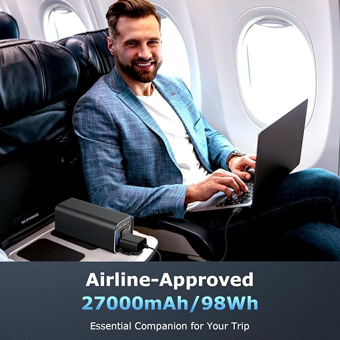 Portable Power Bank, 100W AC Outlet Laptop Charger, 98Wh/27000mAh High Capacity with 65W PD USB C Laptop Battery Bank, Backup Power Source for Business Travel and Outdoor Activities