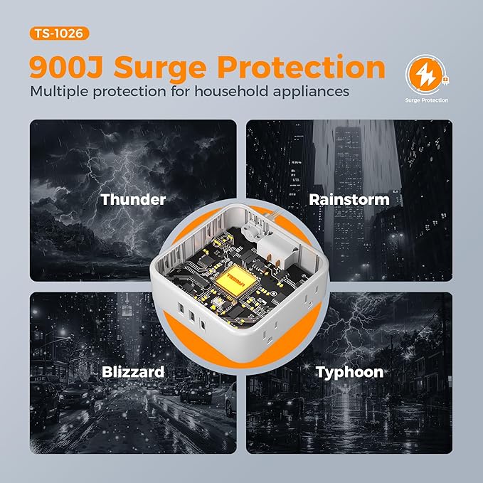 - 900J Surge Protector: Equipped with overload protection, short circuit protection; On/Off switch can automatically shut off to protect your electronics. Power strips with surge protection provide you with a safe and reliable charging environment