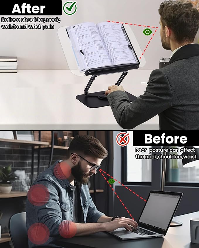 - 360° Adjustable Book Stand: Experience optimal reading or viewing with our 360-degree adjustable book holder. Perfect for studying, cooking, or leisure reading, this book holder stand ensures comfort and convenience, making it a must-have for book lovers and multitaskers