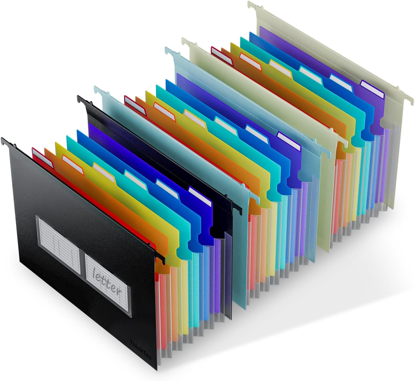 - CHEER UP YOUR FILE CABINET: ThinkTex innovative plastic hanging folder(Not suitable for Manila folders). Designed for letter size files and most standard files cabinets. 7 expandable pockets and 6 colorful dividers, large capacity