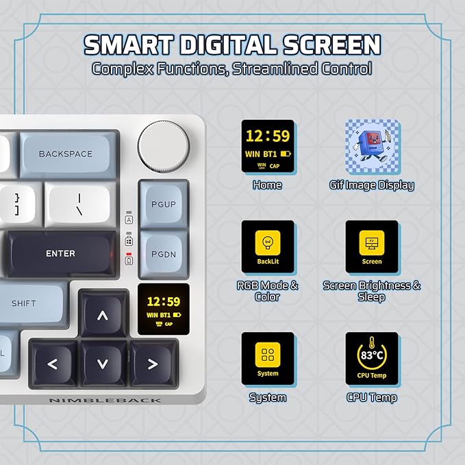 - Compact Screen, Infinite Possibilities — Elevate your control experience with our multifunctional display screen. Keyboard with screen could showcase GIF images, time, battery status, switch WIN/MAC layouts, adjust lighting effects, color, speed and monitor CPU status, etc