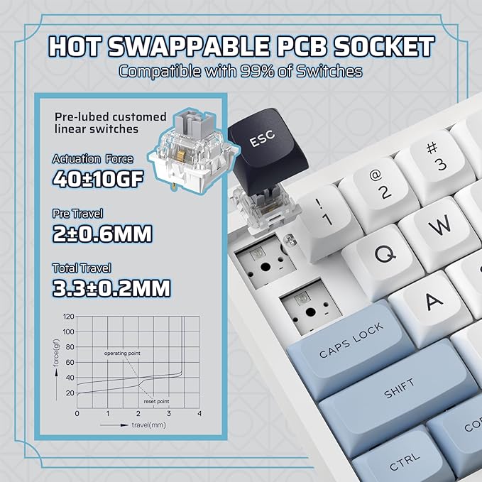 - Customizable Hot-Swap Design — DIY your keyboard effortlessly with our hot-swappable PCB, replacing most 3-pin and 5-pin switches without soldering. Compatible with popular MX-style switches like Gateron and Kailh for personalized performance