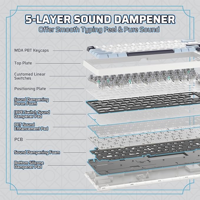 - Five-Layer Sound Padding — With five layers of internal padding, including four dampening mats that significantly minimize hollow sounds and cavities noise and one PET sound-enhancement film, typing becomes remarkably smooth and pleasing. Complemented by MDA profile oil-resistant PBT keycaps for enhanced typing comfort
