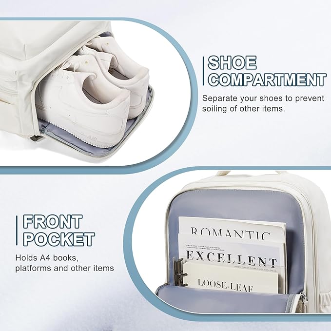 - Spacious Travel Backpack: Features dual main compartments to easily store personal items and clothing for quick access. It also includes two front pockets—a smaller one for daily essentials and a larger one that fits a 14-inch laptop—plus two side pockets for water bottles or umbrellas. The casual backpack also has a separate shoe compartment to keep footwear isolated and protect your belongings.