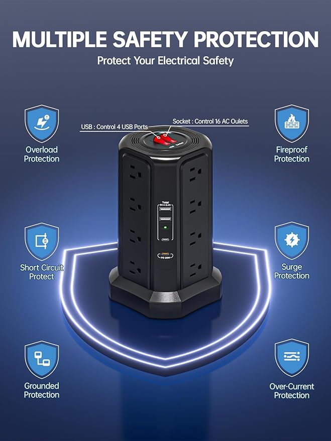 - 【Tower Space Saving Design】With a tower design, this multi outlet tower can save space on the ground by making use of vertical space, making it a great desk power strip.